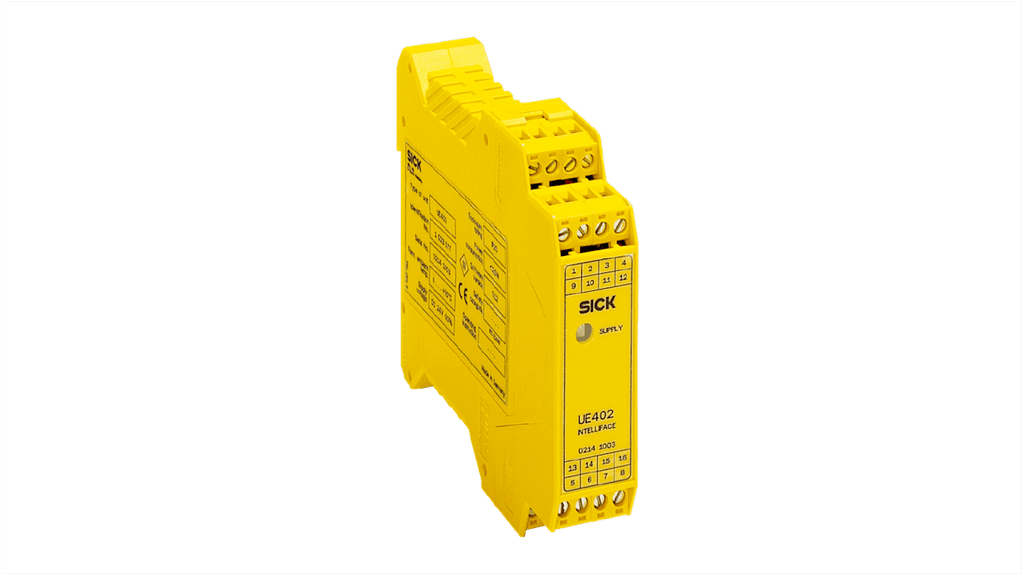 Barriera fotoelettrica di sicurezza, serie UE, modello UE402, marchio Sick. Tipo sicurezza, SIL IEC 61508, SIL 3, PL EN ISO 13849-1, PL e. Dimensioni 22,5 x 99 x 114,5 mm, altezza 99 mm, larghezza 22,5 mm, lunghezza 114,5 mm. Tensione di alimentazione 24 V c.c. Applicazioni in ambienti pericolosi, automazione flessibile, elevata disponibilità.