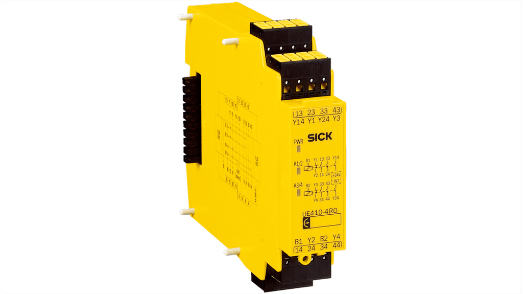 Controller di sicurezza modulare Sick UE410, rivelatore I/O, tensione di alimentazione 24 V c.c., grado di protezione IP20/IP40, dimensioni 22,5 x 96,5 x 120,8 mm, configurazione tramite interruttori rotativi, funzioni logiche AND, OR, muting, bypass, reset, EDM, integrazione in bus di campo comuni, espansione disponibile, SIL 3, terminale a molla a innesto.