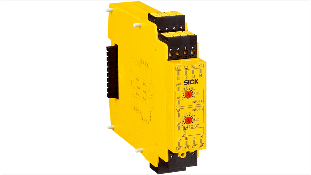 Controller di sicurezza modulare con 8 ingressi e 8 uscite, serie UE410, grado di protezione IP20/IP40, dimensioni 22,5 x 96,5 x 120,8 mm. Configurazione semplice tramite interruttori rotativi, integrazione in bus di campo comuni, espansione disponibile. Categorie di sicurezza 4, SIL 3, terminale a molla a innesto. Funzioni logiche: AND, OR, muting, bypass, reset, EDM. Diagnostica completa per prevenire tempi di inattività.