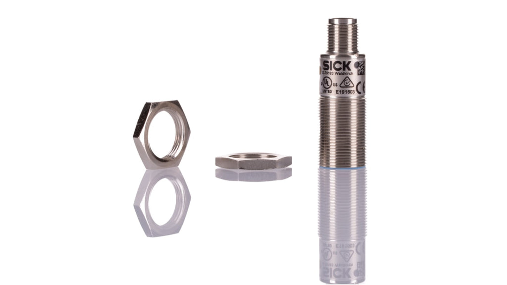 Sensore di prossimità cilindrico a ultrasuoni, M18 x 1, tecnologia PNP e NPN, gamma di rilevamento 65 a 350 mm, tensione di alimentazione 10 a 30 V, corrente di commutazione 100 mA, frequenza di commutazione massima 12 Hz, grado di protezione IP65 e IP67, temperatura operativa da -25 a +70 gradi, custodia in metallo, connettore maschio assiale, protezione da inversione di polarità e sovraccarico. Codice costruttore UM18-21212A211.
