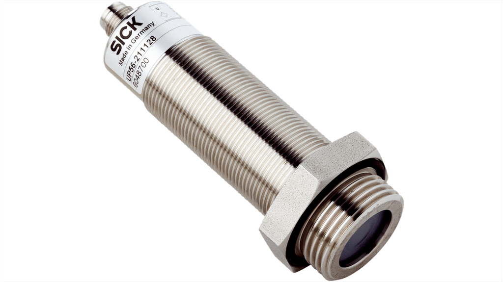 Sensore di livello a ultrasuoni, montaggio filettatura G1, verticale, serie UP56. Misurazione senza contatto fino a 3,4 m, distanza di scansione limite 8,0 m, resistente a pressioni fino a 6 bar. Uscita analogica commutabile 4 mA a 20 mA e 0 V a 10 V, grado di protezione IP67. Temperatura operativa da -25°C a +70°C, corrente massima 200 mA, corpo in acciaio inox, guarnizione in FKM. Certificazione CE.