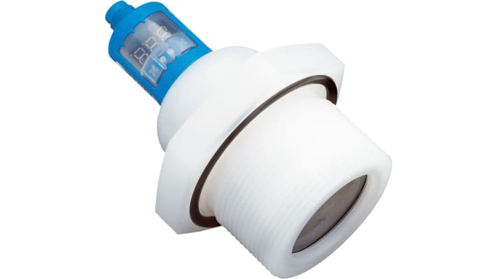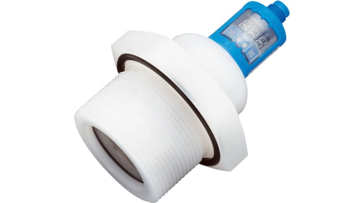 Sensore di livello a ultrasuoni, montaggio filettatura G2, uscita 0-10 V, 4-20 mA, PNP. Intervallo di misurazione fino a 3,4 m, pressione massima 6 bar, temperatura operativa da -25 a +70 gradi Celsius. Corpo in PBT, PVDF, TPU, convertitore protetto in PvDF. Certificazione CE, funzionamento semplice tramite Connect+.