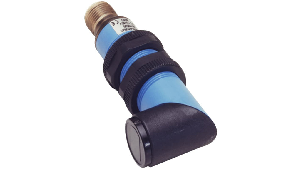 Sensore fotoelettrico cilindrico a retroriflessione, gamma di rilevamento 3,7 m, uscita PNP, connettore M12 a 4 pin, tensione massima 30V, sorgente di luce LED, grado di protezione IP67, tempo di risposta 2 ms, temperatura operativa da -25 a +70 gradi Celsius, custodia in plastica, serie V18.