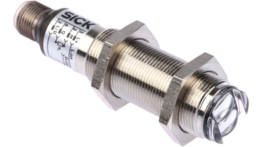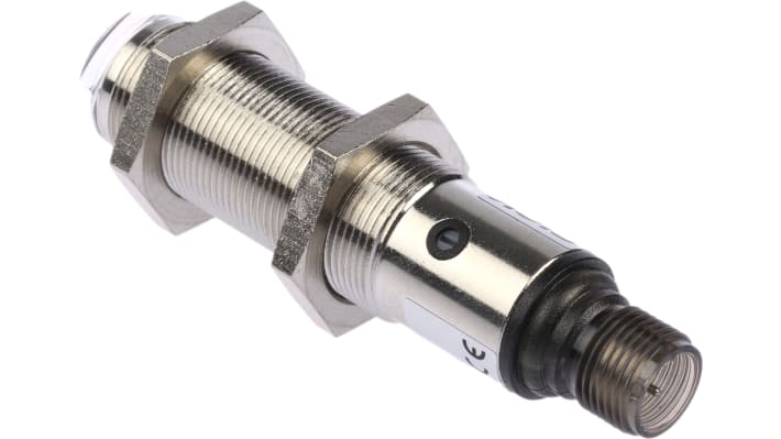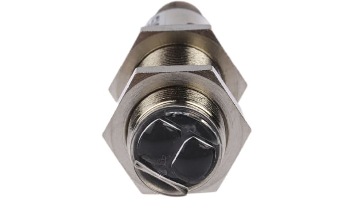 Sensore fotoelettrico cilindrico a retroriflessione, gamma di rilevamento 50 mm a 3,7 m, uscita PNP, connettore a 4 pin M12, tensione massima 30V, corrente massima 100 mA, tempo di risposta inferiore a 2 ms, grado di protezione IP67, temperatura operativa da -25°C a +70°C, custodia in ottone nichelato, montaggio filettato, serie V18.