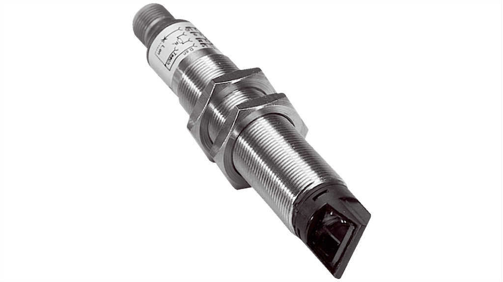 Sensore fotoelettrico cilindrico a retroriflessione, gamma di rilevamento 0,1 a 35 m, uscita NPN, tempo di risposta 0,625 ms, grado di protezione IP67, custodia in metallo, connettore M12 a 4 pin, tensione massima 30V, corrente massima 20 mA, temperatura operativa da 25 a 55 gradi Celsius, laser classe 1, serie V18, conforme a standard CE.