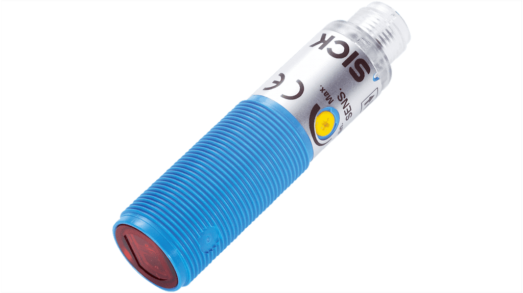 Sensore fotoelettrico cilindrico a fascio diretto, gamma di rilevamento 0 a 28 m, uscita commutazione buio, connettore M12, tensione massima 30V, corrente massima 100 mA, tempo di risposta 0,0005 secondi, temperatura operativa da -25 a +55 gradi, grado di protezione IP67, custodia in plastica, LED di segnale rosso, alta frequenza di commutazione fino a 1000 Hz. Modello V180-2.