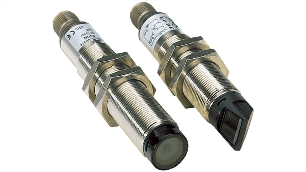 Sensore fotoelettrico cilindrico a fascio passante, gamma di rilevamento 60 m, uscita PNP, tempo di risposta 0,5 ms, grado di protezione IP67, connettore M12 a 4 pin, tensione massima 30V, corrente massima 100 mA, temperatura operativa da -15 a +55 gradi, custodia in metallo, standard CE e cURus, serie V18 Laser.