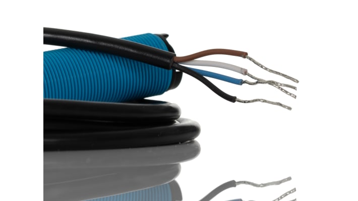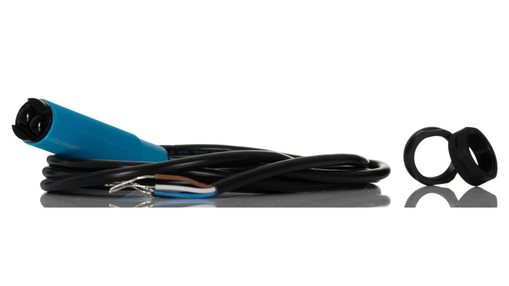 Sensore fotoelettrico cilindrico a diffusione, rilevamento 105 mm, uscita PNP, scansione diffusa con soppressione sfondo, contenitore in ottone nichelato o PA con lente PMMA, grado di protezione IP67, indicazione di stato a LED, corrente senza carico 40 mA, temperatura operativa -25 a 70 gradi Celsius, protezione contro cortocircuiti, sovraccarico e inversione di polarità, dimensioni 81 mm, cavo a 3 fili da 2 m.