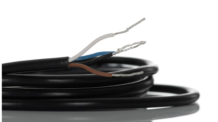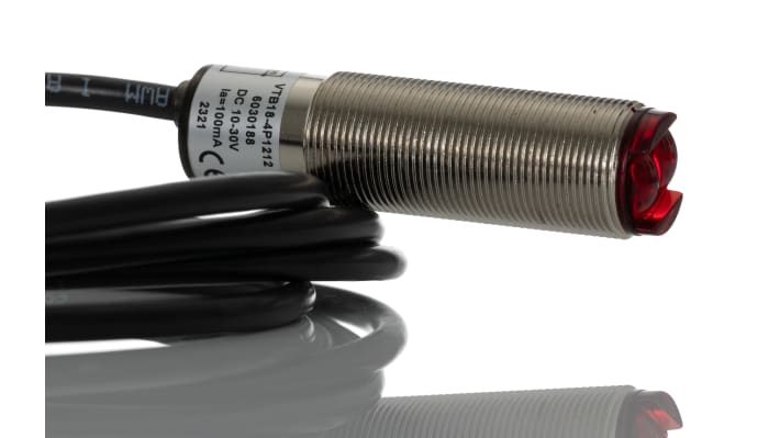 Sensore fotoelettrico cilindrico a soppressione di sfondo, gamma di rilevamento 25 a 140 mm, uscita PNP, commutazione luce/buio, collegamento elettrico con cavo di 2 metri, tensione massima 30V, corrente massima 100 mA, tempo di risposta 0,5 ms, grado di protezione IP67, temperatura operativa da -25 a +70 gradi, custodia in metallo, montaggio a pannello, dimensione filetto M18 x 1, conforme a CE e cURus.
