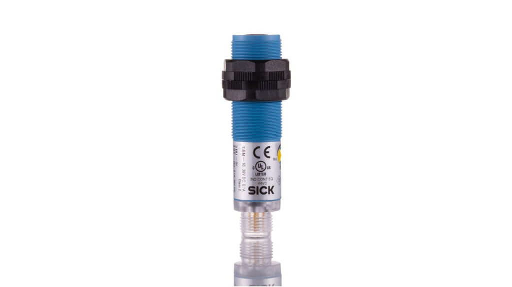 Sensore fotoelettrico cilindrico, rilevamento da 1 mm a 500 mm, uscita commutazione luminosa PNP, grado di protezione IP67, tensione massima 30V, corrente massima 100 mA, tempo di risposta 0,0005 secondi, temperatura operativa da -25°C a +55°C, connettore M12 a 3 pin, custodia in plastica, serie V180-2. Alte frequenze di commutazione fino a 1000 Hz, LED di segnale visibile a 360°.