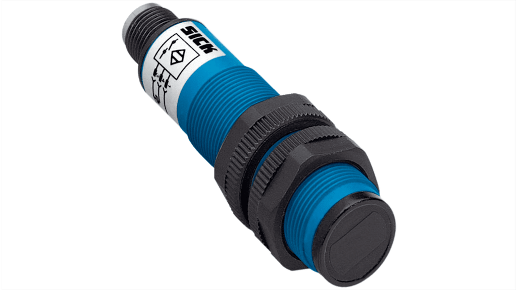 Sensore fotoelettrico cilindrico, rilevamento a soppressione di sfondo, gamma di rilevamento 3 mm a 100 mm, uscita PNP, collegamento elettrico a 3 fili, tensione massima 30V, corrente massima 100 mA, tempo di risposta 0,002 secondi, temperatura operativa da -25°C a +70°C, grado di protezione IP67, materiale custodia plastica, serie V18, conforme a standard CE e UL.