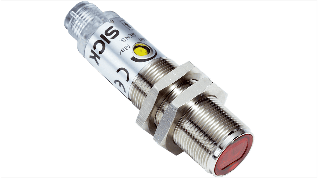 Sensore fotoelettrico cilindrico a soppressione di sfondo, gamma di rilevamento 1 mm a 140 mm, uscita NPN, connettore M12 a 4 pin. Tensione massima 30V, corrente massima 100 mA, tempo di risposta 0,0005 secondi. Grado di protezione IP67, temperatura operativa da -25°C a +55°C. Custodia in metallo, serie V180-2, conforme a CE e UL.