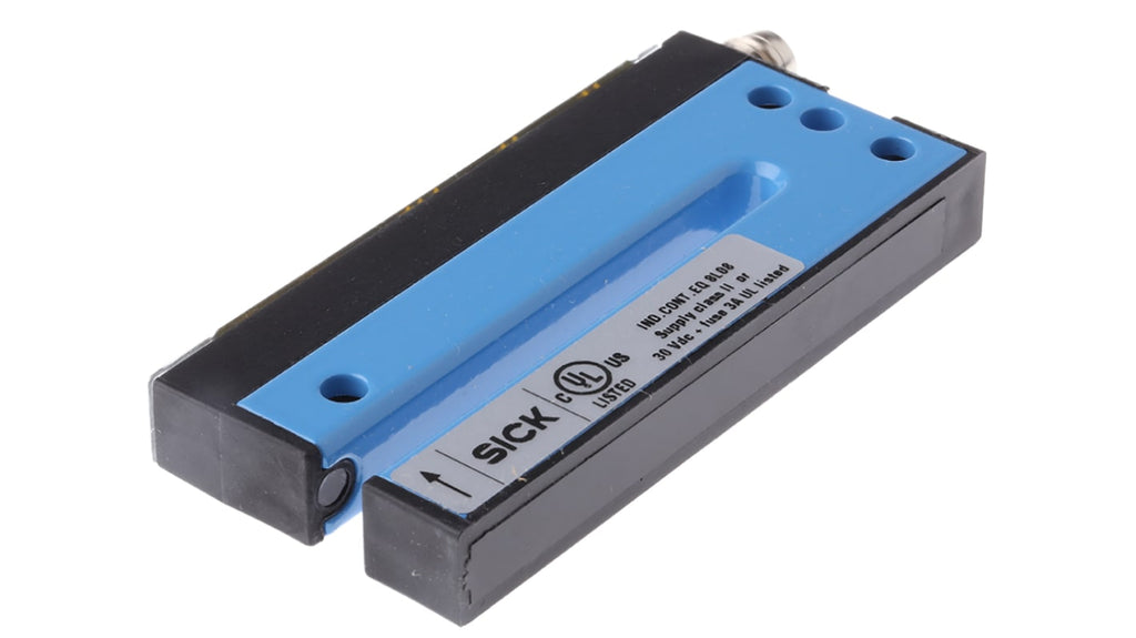 Sensore fotoelettrico a forcella, rilevamento 5 mm, uscita PNP, connettore a 4 pin M8, tensione massima 30V, corrente massima 100 mA, tempo di risposta 100 μs, gamma di temperatura da -20 a +60 °C, grado di protezione IP65, custodia in alluminio, montaggio a pannello, indicazione LED, teach-in tramite pulsante o cavo remoto, protezione cortocircuito e soppressione impulsi. Dimensioni 12 x 80 mm.