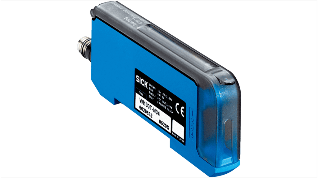 Sensore fotoelettrico rettangolare con uscita PNP, modello WI130T-P720, marchio Sick. Linea laser parallela larga 30 mm, tensione massima 24V, corrente massima 100 mA, tempo di risposta 5 ms. Grado di protezione IP50, temperatura operativa da -25°C a +55°C, montaggio a pannello, materiale custodia in plastica. Standard CE e cURus. Collegamento elettrico con cavo di 2 m e 7 fili.