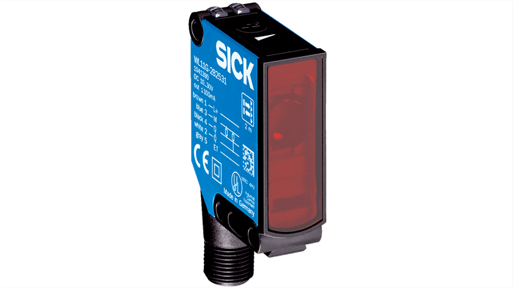 Sensore fotoelettrico rettangolare a retroriflessione, rilevamento 0 a 4 m, uscita NPN e PNP, con connettore M12 a 5 pin. Grado di protezione IP66, IP67, IP69K. Tempo di risposta 2,5 ms, temperatura operativa da 30 a 60 gradi Celsius. Alloggiamento in plastica resistente a agenti chimici e meccanici. Tecnologia LED Pinpoint per rilevamento preciso. Standard CE. Codice costruttore WL11G-2B2531P04.