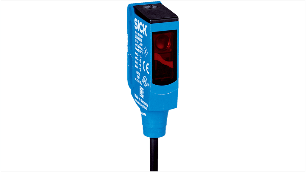 Sensore fotoelettrico rettangolare a retroriflessione, gamma di rilevamento 0 a 4 m, uscita PNP, collegamento con cavo e connettore M8, grado di protezione IP67, corrente massima 30 mA, tempo di risposta 0,5 ms, temperatura operativa da -40 a +50 gradi, materiale custodia plastica, conforme a standard CE e UL. Tecnologia SIRIC, robusto alloggiamento VISTAL.