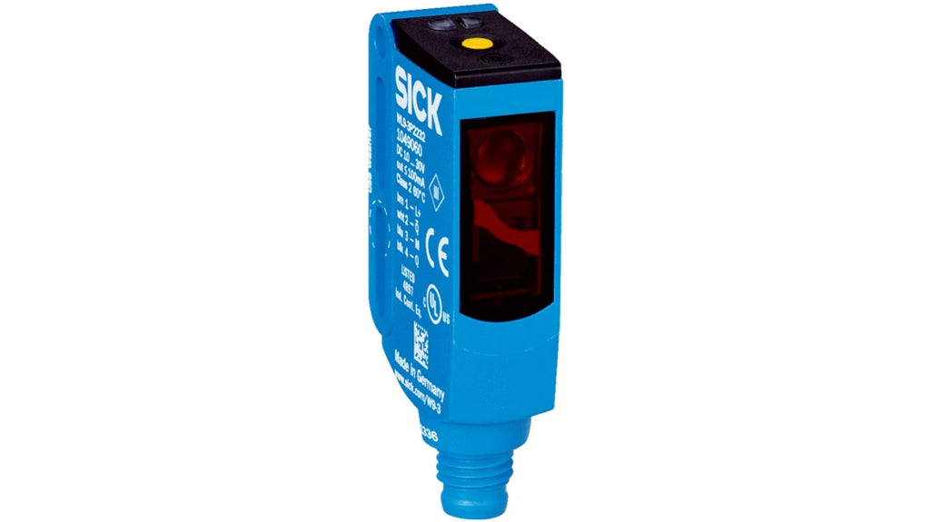 Sensore fotoelettrico rettangolare a retroriflessione, rilevamento fino a 5 m, uscita PNP, con connettore M8 a 4 pin. Sorgente di luce LED, grado di protezione IP66, IP67, IP69K. Temperatura operativa da -40 a +60 gradi Celsius, tempo di risposta 500 microsecondi, custodia in plastica. Serie W9, tecnologia SIRIC per soppressione interferenze ottiche ed elettromagnetiche.