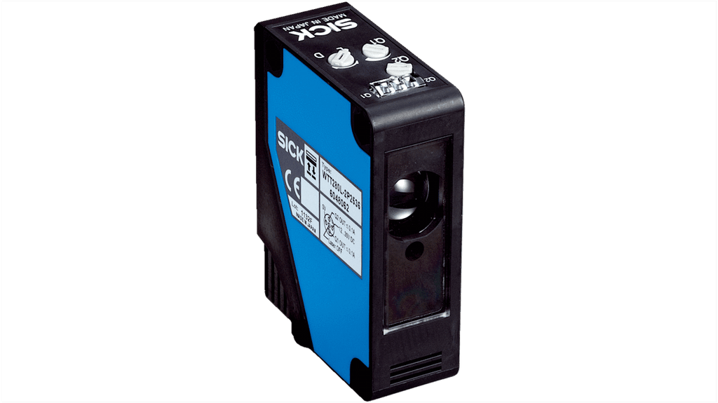 Sensore fotoelettrico rettangolare a soppressione di sfondo, tecnologia del tempo di volo, gamma di rilevamento da 200 mm a 18 m, uscita PNP, connettore M12, tensione massima 30V, corrente massima 100 mA, tempo di risposta 0,0005 secondi, grado di protezione IP67, temperatura operativa da -10°C a +50°C, materiale custodia plastica, conforme a CE e UL.