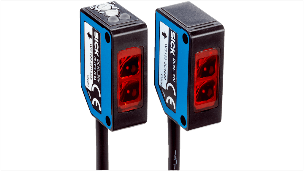 Sensore fotoelettrico miniaturizzato a fascio passante, gamma di rilevamento 0 a 33 m, uscita PNP, con connettore M8. Tensione massima 30V, tempo di risposta 0,5 ms, grado di protezione IP67, operatività da -25 a +55 gradi Celsius. Alloggiamento in plastica, fori di montaggio filettati M3 distanziati di un pollice. Standard CE.