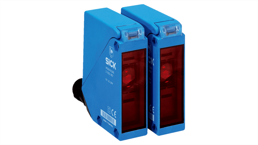 Sensore fotoelettrico rettangolare a fascio passante, gamma di rilevamento 0 a 60 m, uscita NPN e PNP, modalità di commutazione luce/buio. Alloggiamento in plastica ABS, grado di protezione IP67, temperatura operativa da -10 a +50 gradi Celsius, corrente massima 50 mA, tempo di risposta 500 microsecondi, connettore M12 a 4 pin. Standard CE. Codice costruttore WS/WE34-B430. Marchio Sick.