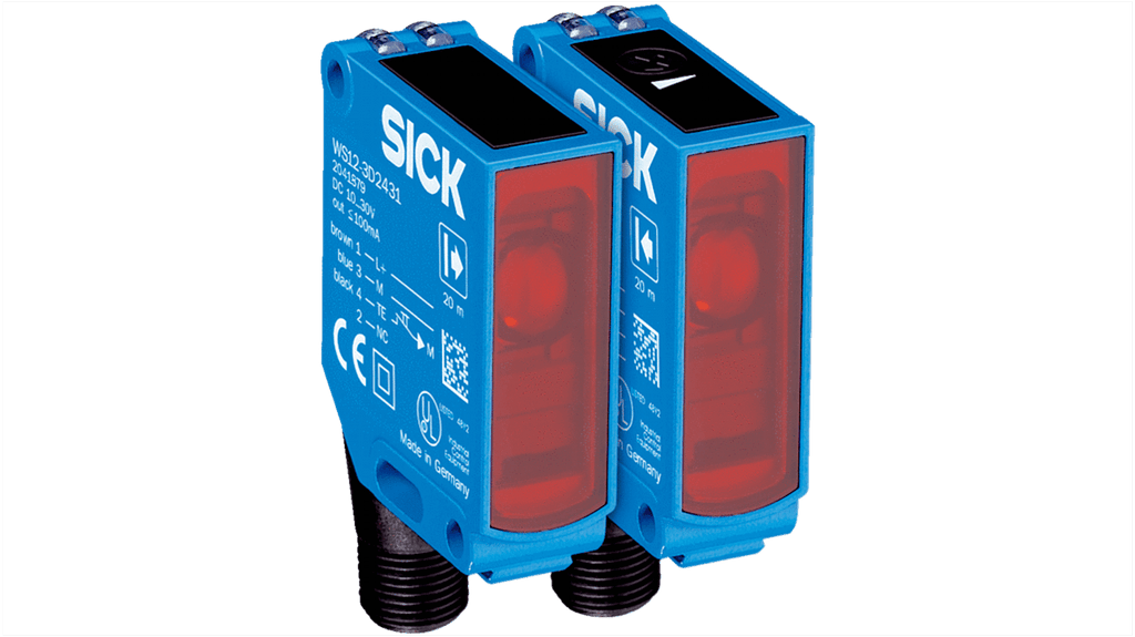 Sensore fotoelettrico a fascio passante, rilevamento fino a 20 m, uscita PNP, tensione massima 30V, corrente massima 100 mA, tempo di risposta 330 μs, temperatura operativa da -40°C a +60°C, grado di protezione IP66, IP67, IP69K, alloggiamento in metallo, montaggio filettato, sorgente di luce LED, standard CE, cULus, ECOLAB. Codice costruttore WSE12-3V1111S01, marchio Sick.