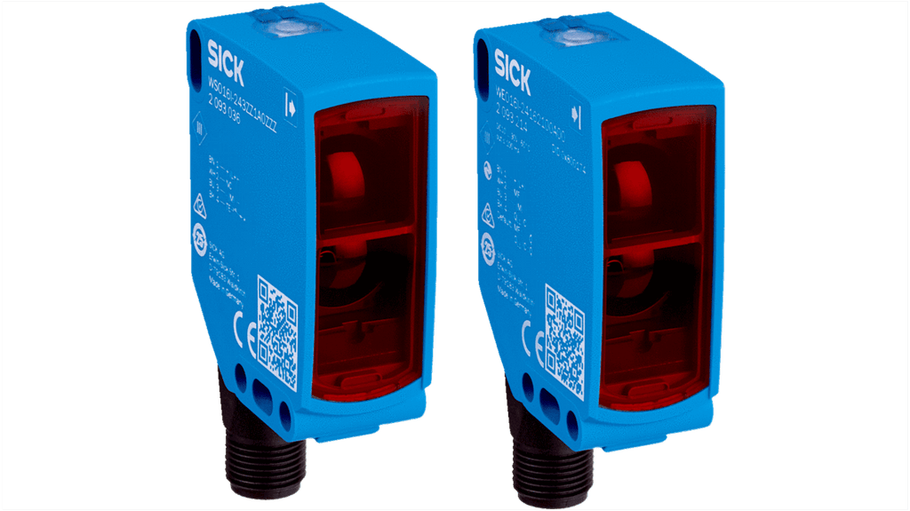 Sensore fotoelettrico rettangolare a fascio diretto, gamma di rilevamento 0 a 45 m, uscita commutazione luce/buio, NPN, PNP, PUSH/PULL, connettore M12 a 4 pin, tensione massima 30V, corrente massima 100 mA, tempo di risposta 0,0005 secondi, grado di protezione IP69, temperatura operativa da -40 a +60 gradi, custodia in plastica, conforme a CE e UL. Modello W16, dotato di tecnologie ClearSens, LineSpot, TwinEye e OptoFilter.
