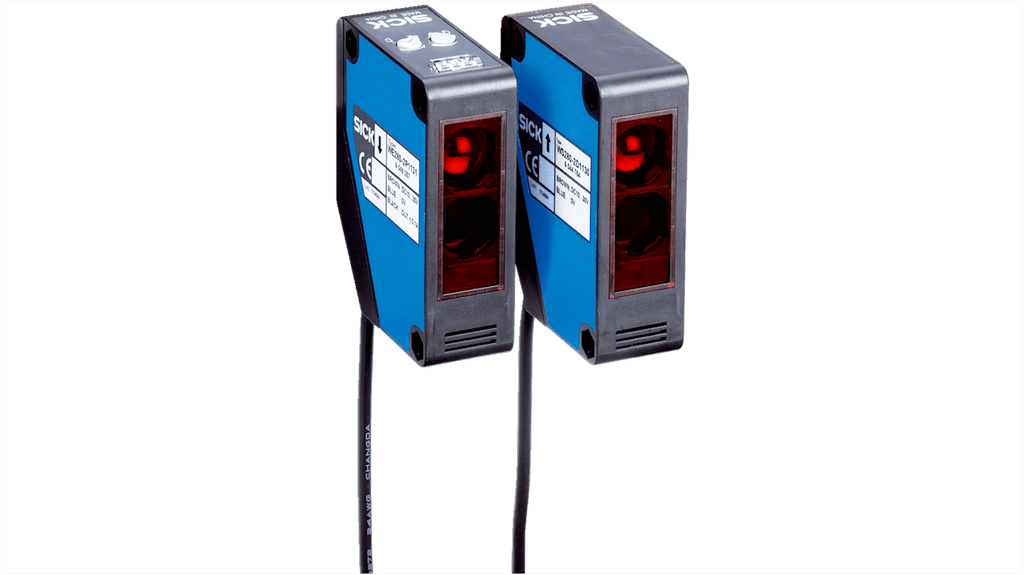 Sensore fotoelettrico compatto a fascio passante, gamma di rilevamento 0 a 60 m, uscita PNP, tensione massima 30 V c.c., grado di protezione IP67, tempo di risposta 0,5 ms, custodia in plastica, temperatura operativa da -25 a +55 gradi, connettore maschio girevole, cavo di 2 metri incluso, staffa di montaggio in acciaio inox, conforme a EN 61000-6-3, standard CE.