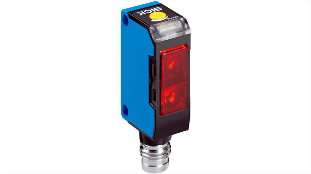 Sensore fotoelettrico rettangolare a soppressione di sfondo, gamma di rilevamento 2 mm a 100 mm, uscita NPN, grado di protezione IP67, luce rossa ad alta visibilità, tempo di risposta 0,0005 secondi, corrente massima 100 mA, tensione massima 30V, connettore M8 a 4 pin, temperatura operativa da -25°C a +55°C, custodia in plastica, conforme a standard CE e UL.