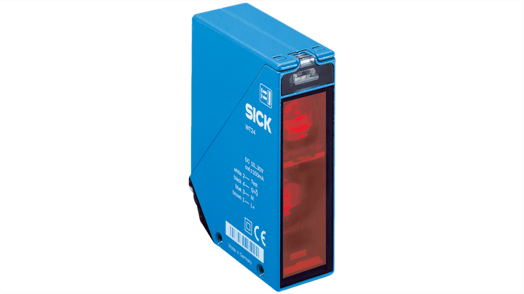 Sensore fotoelettrico rettangolare a soppressione di sfondo, gamma di rilevamento 100 mm a 2,5 m, uscita relè, grado di protezione IP 67, robusto contenitore in metallo, temperatura operativa da -40 a +60 gradi, corrente massima 3 A, tensione massima 250 V c.a. e c.c., tempo di risposta 0,01 secondi, connettore a 5 pin, conforme a CE e UL.