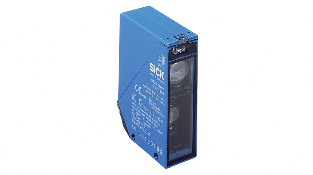 Sensore fotoelettrico rettangolare a soppressione di sfondo, gamma di rilevamento 40 mm a 2 m, uscita NAMUR, connettore maschio M12 ruotabile di 90 gradi, robusto contenitore in metallo, grado di protezione IP 67, temperatura operativa da -20 a +60 gradi, conforme a IECEx e ATEX categoria 2 G, tempo di risposta 0,01 secondi, certificazioni CE e UL. Codice costruttore WT24-2X400.
