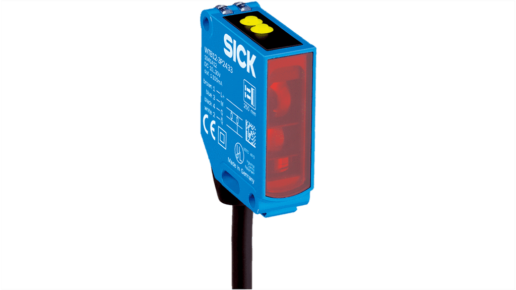 Sensore fotoelettrico rettangolare a soppressione di sfondo, gamma di rilevamento 20 a 350 mm, uscita PNP, modalità di commutazione luce/buio, cavo con connettore M12, tensione massima 30V, corrente massima 45 mA, tempo di risposta 0,5 ms, grado di protezione IP67, custodia in metallo, temperatura operativa da 30 a 60 gradi Celsius, conforme a standard CE.