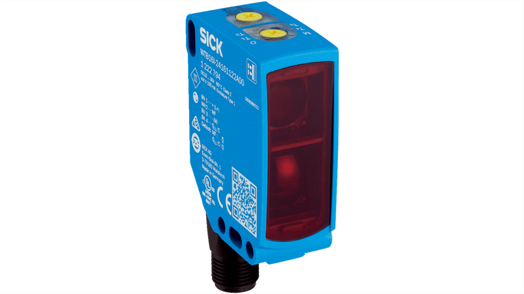 Sensore fotoelettrico rettangolare a soppressione di sfondo, rilevamento 10 a 1500 mm, uscita PNP/NPN, connettore maschio M12, protocollo IO-Link, grado di protezione IP66/IP67/IP69, tensione massima 30V, corrente massima 100 mA, temperatura operativa da -40 a +60 gradi, custodia in plastica, montaggio filettato, serie W16, conforme a CE, cULus, ECOLAB. Tecnologie integrate: ClearSens, Line Spot, Twin Eye, OptoFilter.