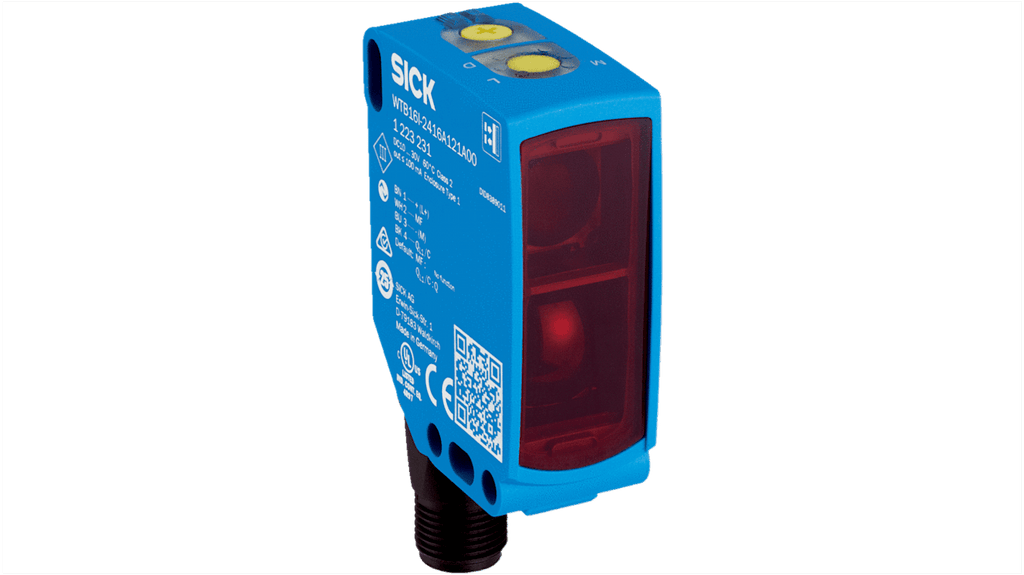 Sensore fotoelettrico rettangolare a soppressione di sfondo, rilevamento 10 a 1500 mm, uscita PNP/NPN, con connettore maschio M12. Tensione massima 30V, corrente massima 100 mA, grado di protezione IP66, IP67, IP69. Interfaccia IO-Link V1.1, tempo di risposta 500 microsecondi, temperatura operativa da -40 a +60 gradi Celsius. Custodia in plastica, montaggio filettato, conforme a CE, cULus, ECOLAB. Tecnologie integrate: ClearSens, Line Spot, Twin Eye, OptoFilter.