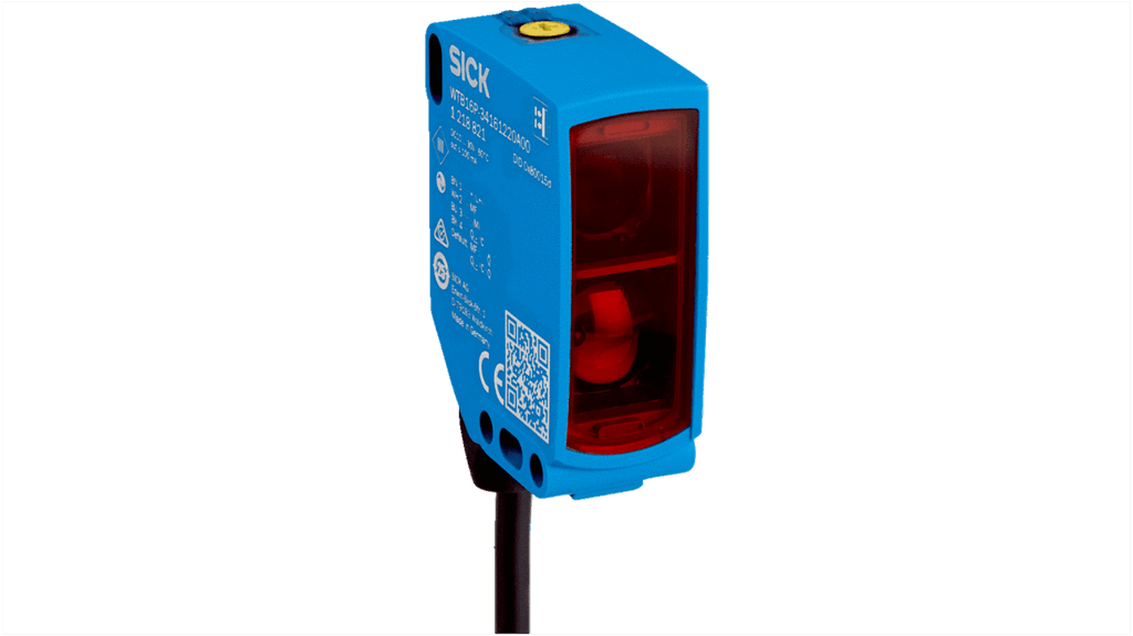 Sensore fotoelettrico rettangolare a soppressione di sfondo, gamma di rilevamento 10 a 1500 mm, uscita PNP/NPN, tempo di risposta 500 microsecondi, corrente massima 30 mA, tensione massima 30V, grado di protezione IP66/IP67, temperatura operativa da -40 a +60 gradi Celsius, custodia in ABS, compatibile con IO-Link, tecnologie ClearSens, Line Spot, Twin Eye, OptoFilter. Codice costruttore WTB16I-34115120ZZZ, marchio Sick.