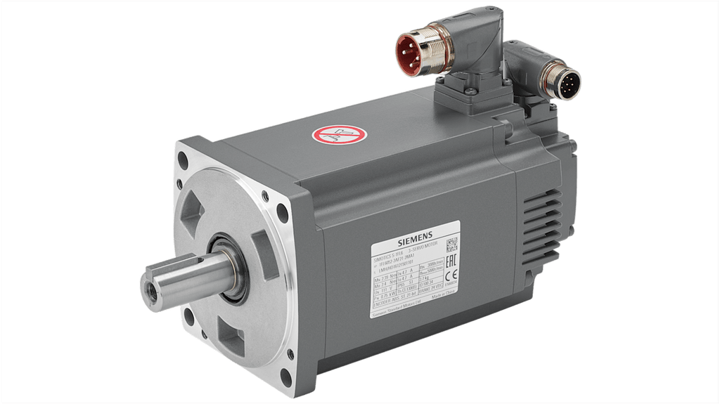 Servomotore monofase Sincrono Siemens, 2 kW, 230 V. Potenza nominale 2 kW, tipo di motore sincrono, tensione di alimentazione 230 V, fase 1, velocità nominale 3000 giri/min, velocità massima 5000 giri/min, coppia nominale 6,37 Nm, raffreddamento naturale, grado di protezione IP65, grado A di gravità delle vibrazioni. Codice costruttore 1FL6054-2AF21-2MB1.