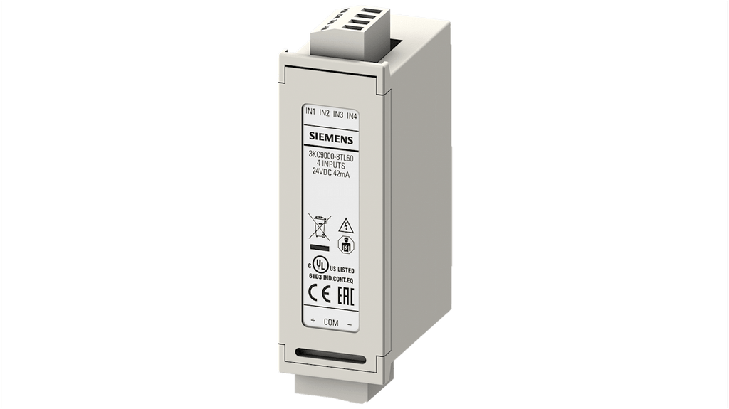 Sezionatore portafusibili Siemens, modello Sentron 3KC9, codice 3KC9000-8TL60, approvazione EAC. Modulo di espansione con 4 ingressi digitali, compatibile con ATC6500 e ATC6300. Specifiche tecniche: range, serie 3KC9. Design robusto, adatto per applicazioni industriali.