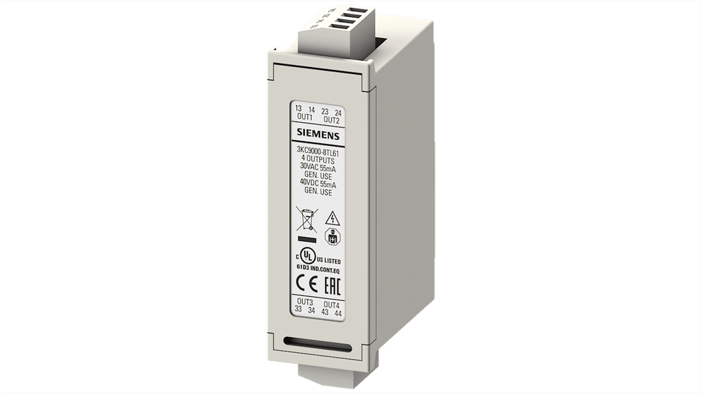 Sezionatore portafusibili Siemens, modello Sentron 3KC9, codice 3KC9000-8TL61. Contenitore in poliammide, approvazione CE ed EAC. Specifiche tecniche: range, serie 3KC9. Accessorio per ATC6500 e ATC6300, dotato di 4 uscite digitali compatibili allo stato solido con 4 contatti normalmente aperti.