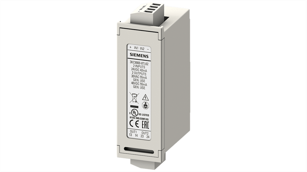 Sezionatore portafusibili Siemens, modello Sentron 3KC9, codice 3KC9000-8TL62, approvazione EAC. Include relè 2DO con 2 uscite relè e 2 contatti di commutazione. Progettato per moduli di espansione Siemens ATC6, compatibile con innesti ATC6300 e ATC6500. Specifiche tecniche: Range, Sentron, Serie 3KC9.