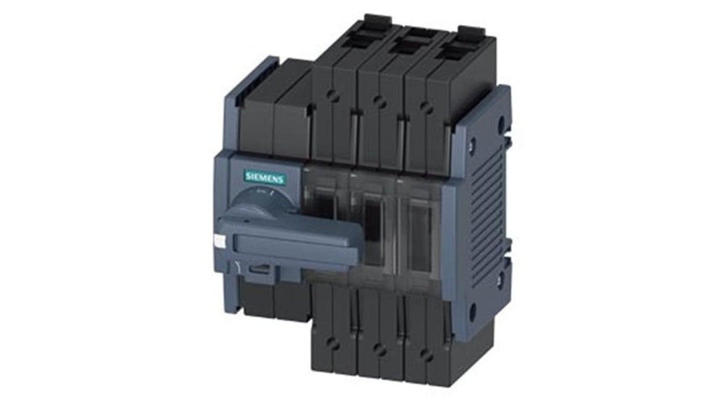 Sezionatore con interruttore Siemens, 3 poli, corrente massima 80A, montaggio su guida DIN, grado di protezione IP20, potenza nominale 55kW, meccanismo di azionamento anteriore a sinistra, unità di base senza maniglia, approvazione EAC, approvazione CE.