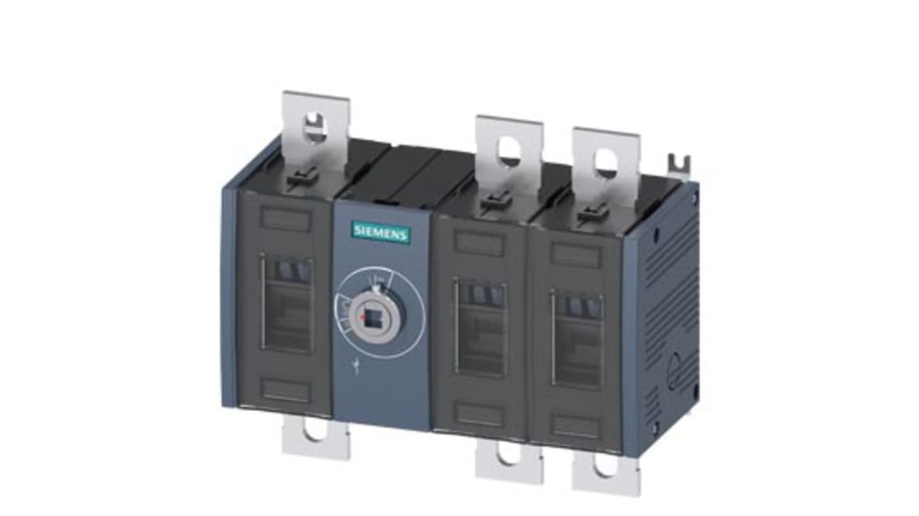 Sezionatore con interruttore Siemens, corrente massima 315A, 3 poli, meccanismo di azionamento anteriore, posizione centrale dell'interruttore, design del collegamento elettrico con connettore piatto, unità di base senza maniglia, funzione di scollegamento di sicurezza, isolamento in circuiti a bassa tensione. Codice costruttore 3KD4030-0PE20-0.