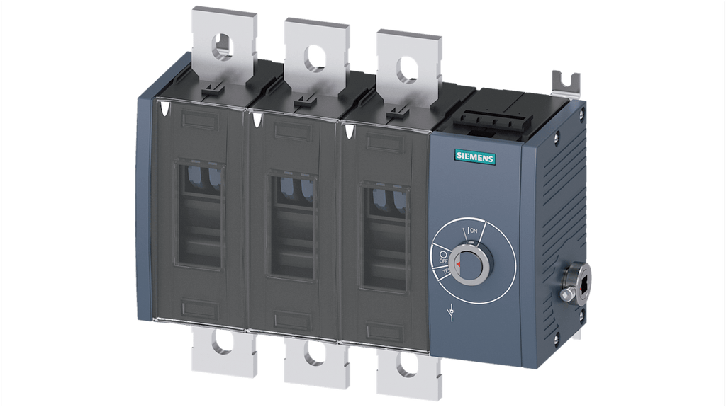 Sezionatore con interruttore Siemens, 3 poli, corrente massima 500A, montaggio superficiale, classe di protezione IP00, potenza nominale 12W, configurazione stato normale NO, serie 3KD, modello 3KD4434-0QE40-0. Dispositivo per protezione e commutazione, meccanismo di funzionamento anteriore con posizione centrale.