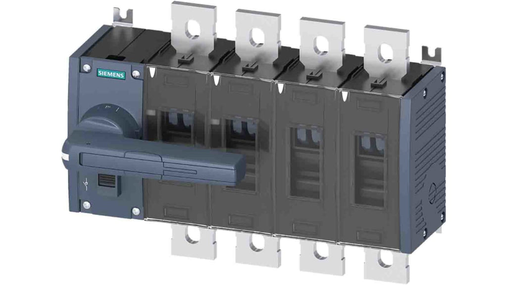 Sezionatore con interruttore Siemens, corrente massima 500 A, 4 poli, montaggio a vite, configurazione 8NA/8NC, classe di protezione IP20, tensione di isolamento 1000 V, temperatura operativa da -25 a +70 gradi, resistenza alle sovratensioni 12 kV, vita meccanica 8000 cicli, vita elettrica 1000 cicli, design del connettore piatto, contatti ausiliari disponibili.