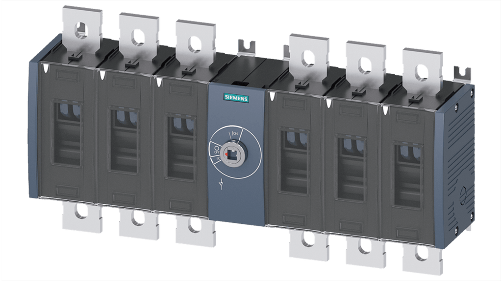 Sezionatore con interruttore Siemens, meccanismo di funzionamento anteriore, posizione centrale, 6 poli, corrente massima 630A, protezione IP00 e IP20, potenza nominale 10,8W, configurazione stato normale NO, serie 3KD, modello 3KD4660-0QE20-0, compatibile con sistemi SENTRON.