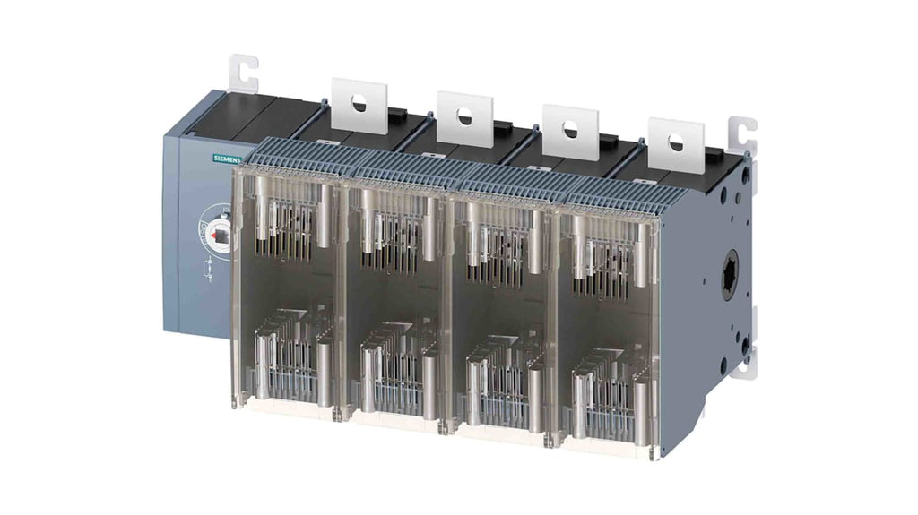 Sezionatore portafusibili Siemens, corrente massima 630 A, configurazione a 4 poli, montaggio superficiale, fusibili NH2 e NH3, resistenza alle sovratensioni 12 kV, vita meccanica 6000 cicli, vita elettrica 1500 cicli, temperatura operativa da -25 a +70 gradi, colore grigio, contatti ausiliari disponibili, serie 3KF, range SENTRON, configurazione stato normale 8NA/8NC.