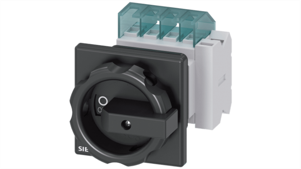 Interruttore sezionatore Siemens 16A 4 poli, montaggio a pannello, meccanismo rotante, impugnatura centrale 22,5 mm, manopola rotante corta, grado di protezione IP65, potenza nominale 7,5 kW. Codice costruttore 3LD2054-2EP51.