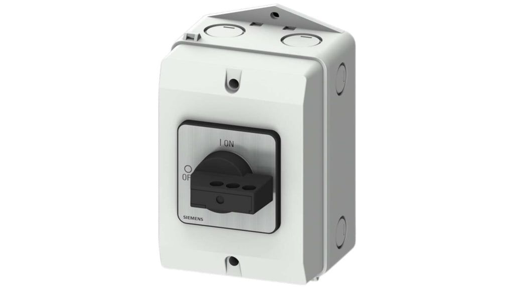 Sezionatore con interruttore Siemens 3LD2184-2GP21, configurazione a 3 poli, corrente massima 25 A, fusibile RK5, stato normale 1NC/1NA, temperatura d'esercizio -25 a 55 gradi, grado di protezione IP65, serie SENTRON, integrato.