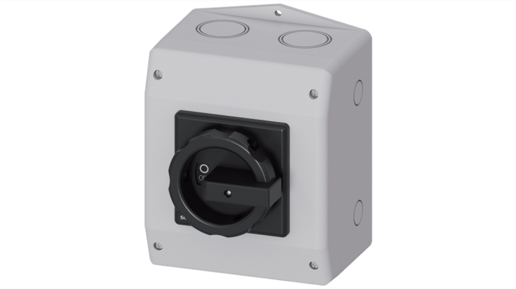 Interruttore sezionatore Siemens 32A 3LD, meccanismo di azionamento rotante, configurazione a 6 poli, montaggio a pannello, incapsulamento in plastica sagomata per collegamento a vite con cavo metrico, protezione IP65, potenza nominale 11,5kW. Codice costruttore 3LD2265-4VD51.
