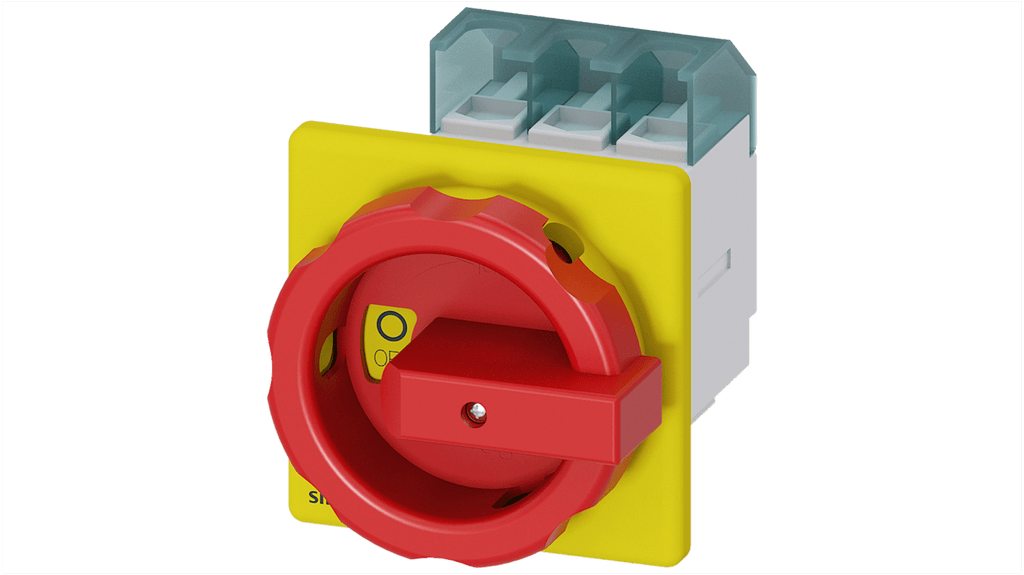 Sezionatore con interruttore a montaggio anteriore, corrente massima 63A, tre poli, dispositivo di montaggio fisso, fusibile integrato, dimensione meccanica fusibile 3, serie SENTRON 3LD, configurazione singolo effetto. Montaggio tramite foro centrale di diametro 22,5 mm. Codice costruttore 3LD2555-0TK53, marchio Siemens.