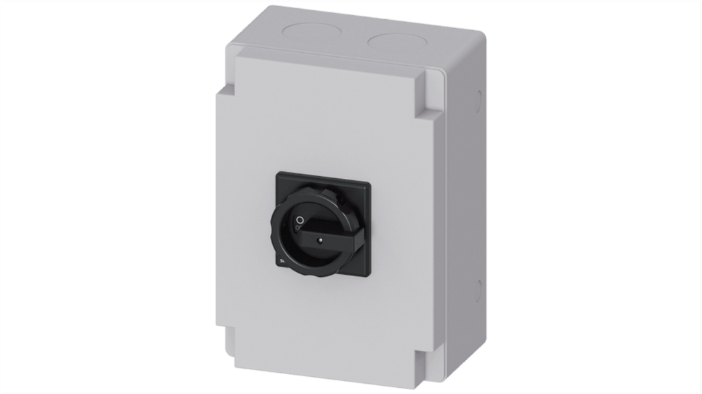 Interruttore sezionatore Siemens 63A 3LD, configurazione a 6 poli, montaggio a pannello, meccanismo rotante, incapsulamento in plastica sagomata per pressacavo metrico, manopola rotante corta, corrente massima 63A, potenza nominale 22kW, grado di protezione IP65.