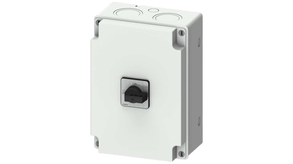 Sezionatore con interruttore Siemens 3LD2586-5VD21, configurazione a 6 poli, corrente massima 63A, fusibile RK5, grado di protezione IP65, temperatura d'esercizio da -25 a 55 gradi Celsius, design integrato, serie SENTRON.